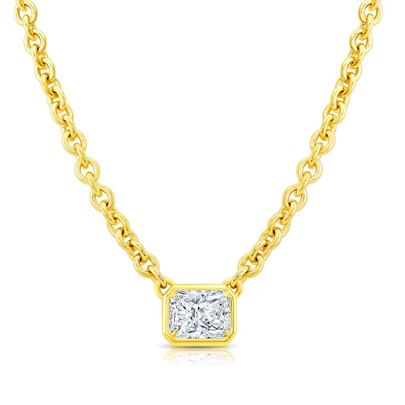 Rahaminov Diamonds’ collections feature both meticulous and unusual cuts that are expertly faceted to highlight and enhance each diamond’s shape. At Rahaminov Diamonds, the diamond inspires the design. This necklace inspired by a radiant cut diamond, features a 2.09ct stone prong and bezel set while masterfully crafted on a cable chain.