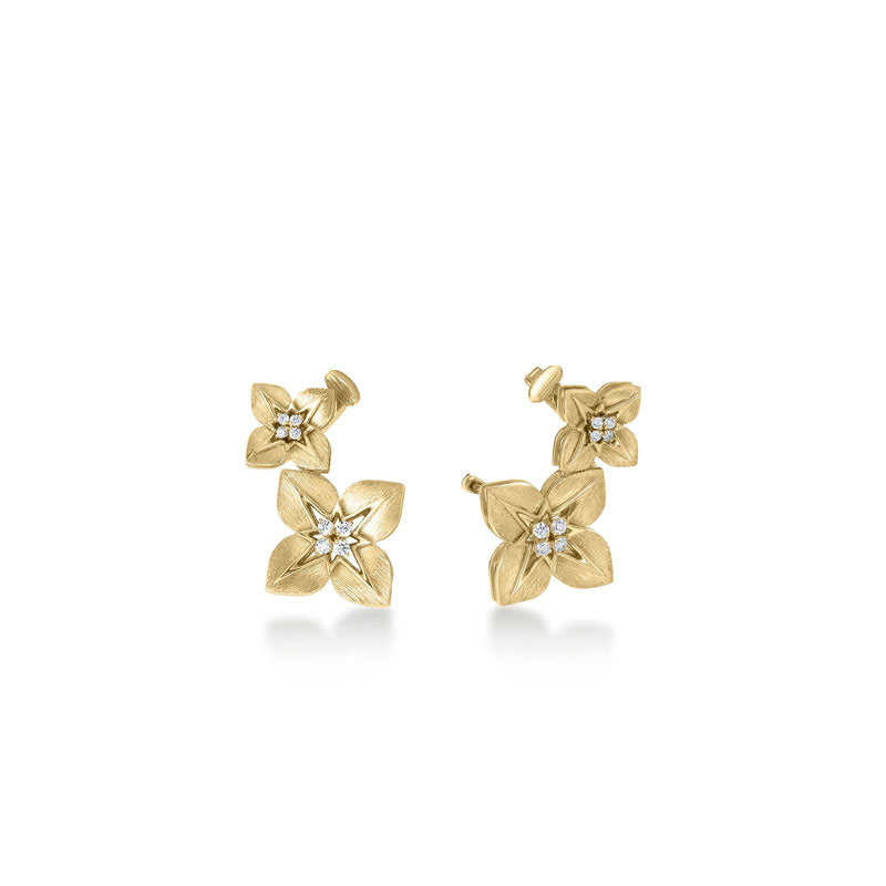 From Roberto Coin's Princess Star collection, comes these double flower stud earrings. Set in 18K yellow gold and white gold with diamond (0.08tcw) cluster centers.