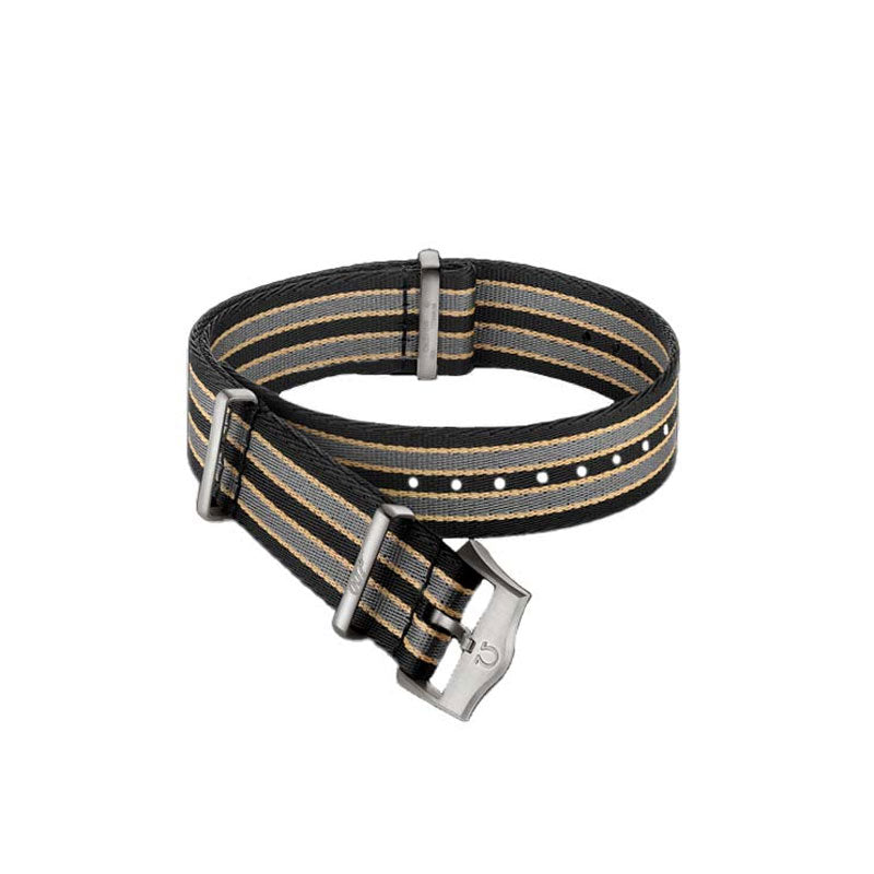 Striped dark brown, grey and beige nylon fabric strap with grade 2 titanium for the buckle and 007 engraved loop.