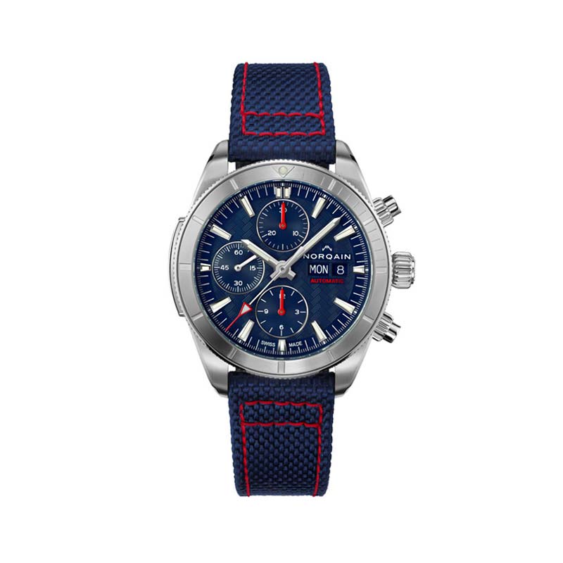 This Adventure Sport Chrono Day/Date 41 features the distinctive "Norqain pattern” on its ocean-blue dial. There is day-date window at 3 o’clock, and three blue sub-dials at 6, 9 and 12 o’clock. The counters are outlined with steel rings, adding an elegant touch to the overall design. The chronograph minutes and chronograph hour sub-dials at 6 and 12 o’clock have red hands while the running seconds sub-dial at 9 o’clock has a white hand. The central chronograph seconds hand stands out with its red tip. The case is made of 316L stainless steel and the knurled bezel is complete with a steel ring. This Norqain Adventure Sport Chrono is fitted with a blue Nordura fabric strap with red stitching. Powering this robust wristwatch is the Norqain caliber NN17, which is visible through the scratch-proof sapphire glass caseback.