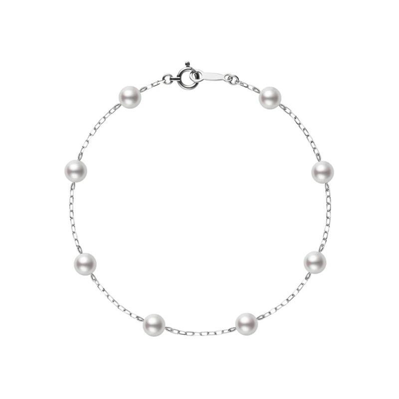 Mikimoto's Station Collection offers variety to everyday wear. The pieces are designed to be worn on their own as a statement, or layered with other classic Mikimoto designs for a more detailed look. This bracelet features Akoya cultured pearls set in 18K white gold and is 7" in length.