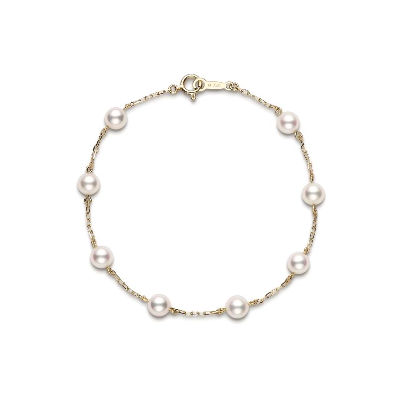 From Mikimoto's Station collection this bracelet features Akoya A+ 5-5.5mm quality pearls set in 18K yellow gold measuring at a length of 6.5".