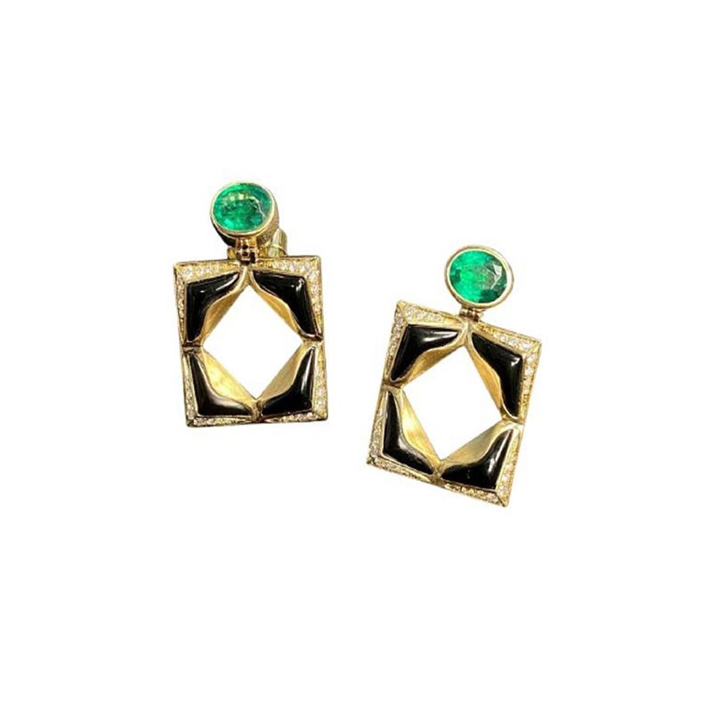 Follow the pathway to grand mysteries. These sideways hoops take the form of an artists’ vision of arches that lead the way to new and exciting journeys and adventures. Though the eye is transfixed by the light, it is the shadows that have more to say. The light, made of 18K Gold and adorned with Diamonds and vibrant Emeralds is contrasted against the Black Jade darkness. These earrings are like large, open windows, inviting us to dive into the unknown. The first step can be scary, but opportunities await.