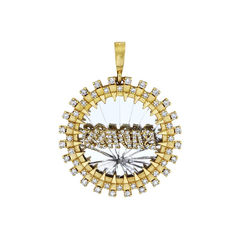 A piece in Arunashi's ‘Mirror Mirror...’ series, this pendant is constructed with a shattered mirror in the background that humorously and unapologetically tells the wearer who they are. Framed by dazzling Diamonds, the word ‘Badass’ is written inverse, as a mirror image, in more exquisite Diamonds. In Arunashi’s dictionary, being deemed a ‘Badass’ is seen is a compliment. It is a tongue- in-cheek turned positive way to express admiration for someone’s outstanding qualities,