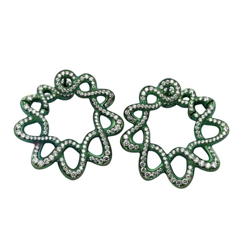 Who are you? Remind yourself of your true nature with these special Double Spiral Earrings, inspired by the double helix of the DNA strand. Widely recognized as one of the most significant scientific breakthroughs of the 20th century, the discovery of DNA is at the center of this statement piece. 276 shimmering diamonds are set into a sumptuous titanium frame—the prongs of each piece are so masterfully set, you won’t feel them as you run your finger over the smooth surface.