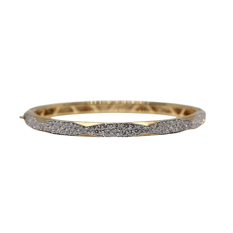 Subtle in its seduction, the Origami Diamond Micropave Bangle is a refined bangle from the Enigma series — where simplicity is never without story. Its surface ripples with a sequence of gently faceted, diamond-encrusted segments, each one precisely articulated in a rhythmic geometry that feels both mathematical and mysterious. The micropavé technique heightens the contrast between shadow and sparkle, like a cipher only visible in the right light. Crafted in luminous gold and seamlessly inlaid with a glittering constellation of white diamonds, the bangle reads like a hidden message encoded in elegance. Minimal yet dimensional, Origami Diamond Micropave Bangle is a study in restraint — and a nod to the beauty found in quiet intricacies.