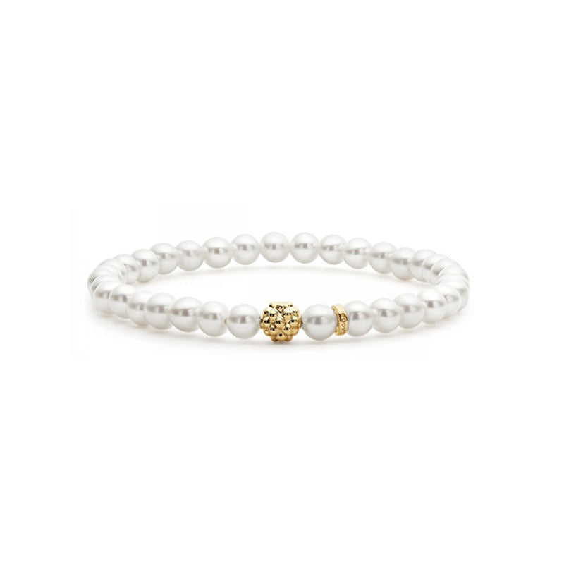 Pearl gemstone bracelet with an 18K gold Caviar beaded station. The stretch fit accommodates most wrist sizes. Freshwater cultured pearls from 5 to 6mm are natural and colors may vary from the image.