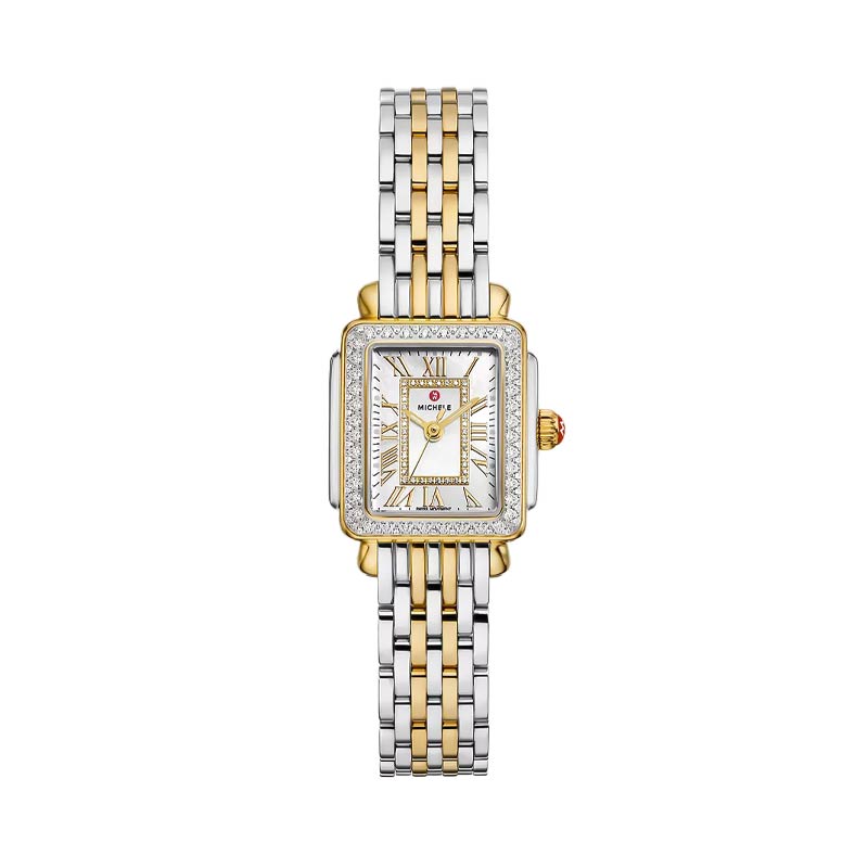 This petite two-tone stainless steel and 18K gold-plated rectangular timepiece perfectly balances vintage-inspired style with a modern edge. The white mother-of-pearl dial shines with 122 diamond accents (0.43 carat weight) and Swiss movement. The two-tone 18K gold-plated bracelet is made specifically for the Deco Madison Mini collection and is interchangeable with any 12mm Michele strap.