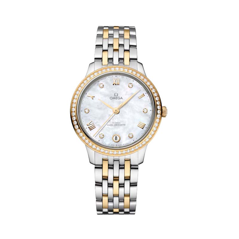A timeless collection since 1994, the Omega De Ville Prestige is now in its third generation. Continuing to represent classical design and refined elegance, the timepieces offer a range of patterns, finishes and colours to suit different lifestyles and personalities. This 34 mm stainless steel and 18K yellow gold model features a diamond-paved bezel and a dial crafted from white mother-of-pearl. The display is distinguished by yellow gold-plated hands, as well as alternating Roman numerals and diamond markers. The pure look of the timepiece is completed by a date window at 6 o’clock, and a dotted minute track on the outer zone. This Master Chronometer certified watch is presented on a stainless steel - yellow gold bracelet and is driven by the Omega Master Co-Axial Calibre 8800, which can be admired through the scratch-resistant sapphire crystal caseback.
