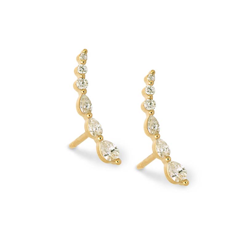 These Diamond Constellation Crawler Earrings create a celestial path of light along your ear. Crafted in 14K gold, these elegant crawlers features a thoughtful arrangement of pear and round cut diamonds that mimic the pattern of stars in a constellation. The graduated placement of the stones creates a sense of movement as they appear to climb gracefully up the ear. Perfect for adding asymmetrical sophistication to your look or pairing with other earrings for a personalized ear story!
