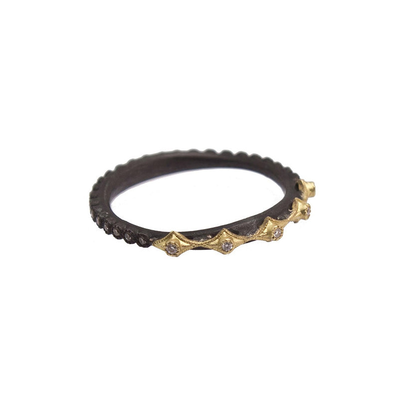 18K yellow gold and blackened sterling silver pave multi Crivelli stack ring with white and champagne diamonds.