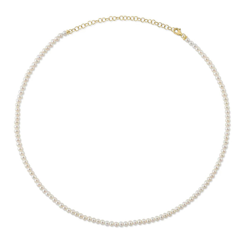 From our Bliss collection, the pearl tennis necklace features 3-4mm size pearls. Add a touch of timeless femininity to your wardrobe with this necklace!