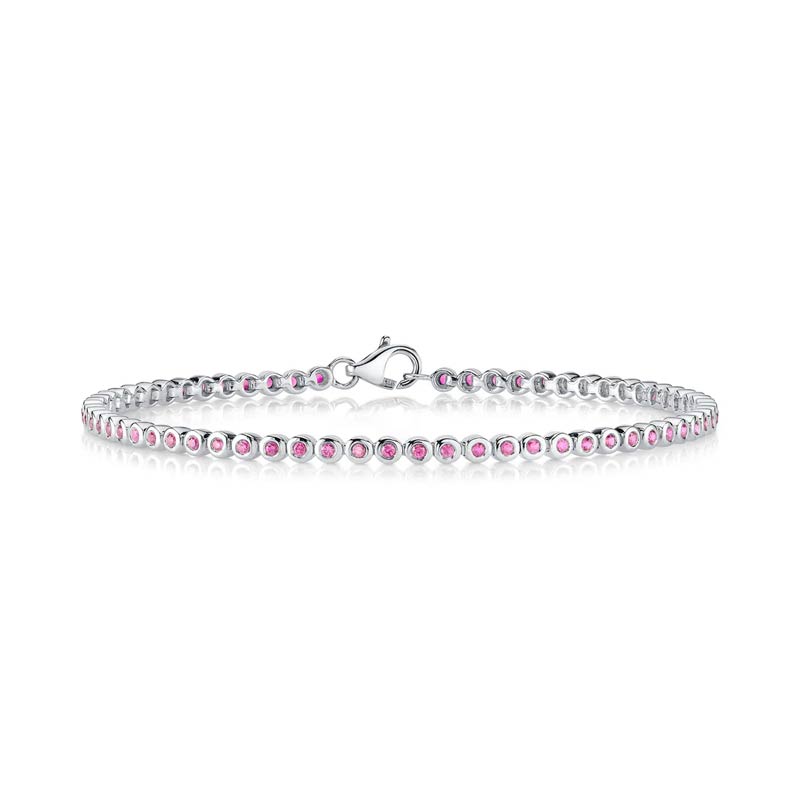 The Bliss pink sapphire tennis bracelet features bezel set round pink sapphires, with a lobster clasp closure. Set in 14K white gold, this bracelet is the perfect pop of color you’re looking for!